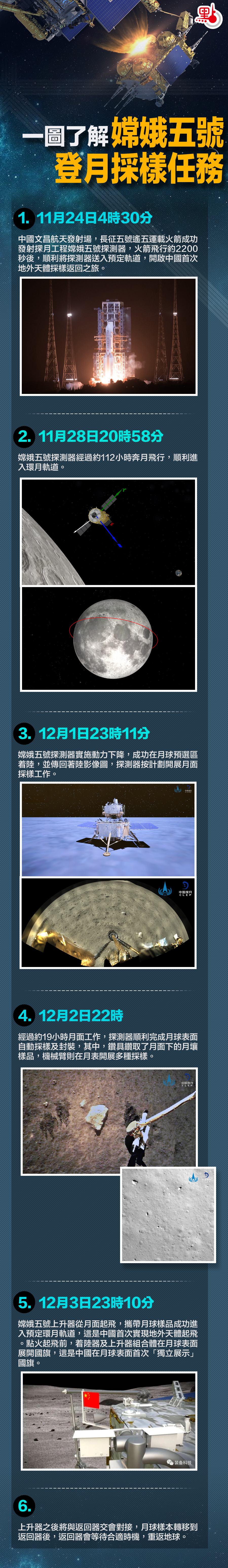 12月3日23時10分,由中國航天科技集團有限公司研製的月球探測器嫦娥五號,成功將攜帶樣品的上升器送入到預定環月軌道,這是中國首次實現地外天體起飛。點火起飛前,嫦娥五號着上組合體實現月面國旗展開,這是中國在月球表面首次實現五星紅旗的「獨立展示」。中國航天科技集團黨組書記、董事長吳燕生說:「這標誌着中國首次掌握了地外天體起飛技術,中國人獨立自主完成載人登月、建立月球空間站,甚至走向更為深遠的太空將不再是夢。」