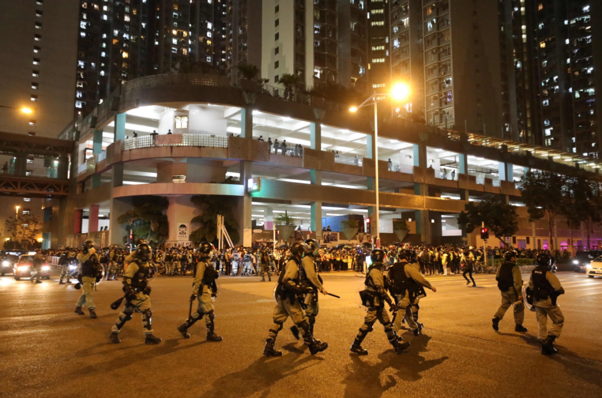 拘捕警員憶述,去年11月12日晚上接受工作安排到將軍澳港鐵站A2出口外執勤,接近午夜11時半時,該處已有許多黑衣人在非法集結,而港鐵站出口當時因為有人投擲汽油彈一度起火。另一邊,他陪同隊員向尚德邨推進,尚德商場和尚智樓附近有30至40名黑衣人聚集,地上滿布磚頭雜物,又有人向警方投擲磚塊和用鐳射筆照射,示威者及後一路向後退至同區的廣明苑廣隆閣,最終散去。