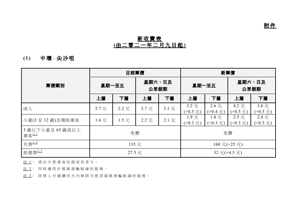 行政長官會同行政會議今日(8日)批准天星小輪旗下「中環-尖沙咀」和「灣仔-尖沙咀」兩條專營渡輪航線加價,平均加幅約為16.5%,即加3至5毫。中環航線新票價每程成人2.6至4.2元,小童1.8至2.5元;灣仔航線新票價每程成人3.2至4.2元,小童1.9至2.5元。當程序完成後,新收費將由明年2月9日開始生效。