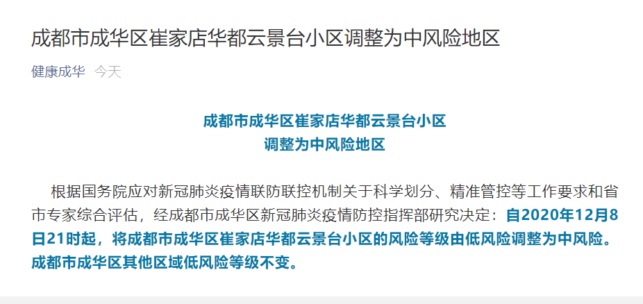 12月8日,經四川省成都市成華區新冠肺炎疫情防控指揮部研究決定:自12月8日21時起,將成都市成華區崔家店華都雲景台小區的風險等級由低風險調整為中風險。成都市成華區其他區域低風險等級不變。