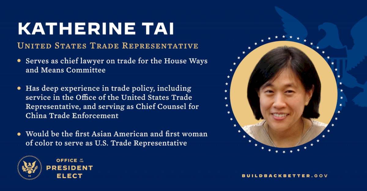 美國候任總統拜登於當地時間10日宣布,提名美籍華人戴琦出任美國貿易代表,如果任命獲通過,將會是當地首名華裔及女性貿易代表,並會領軍參與中美經貿談判。