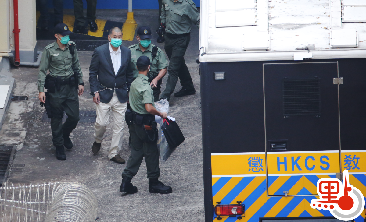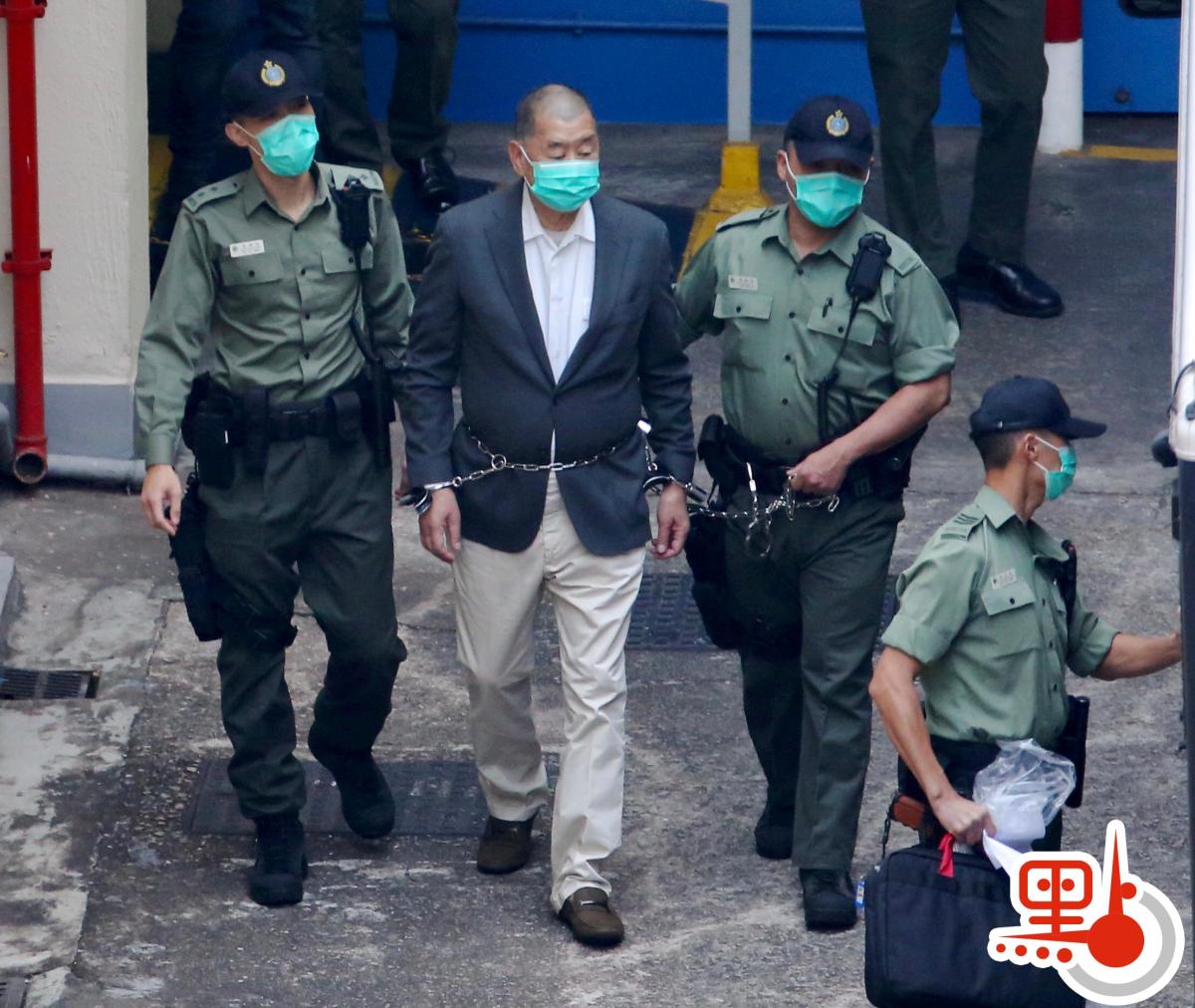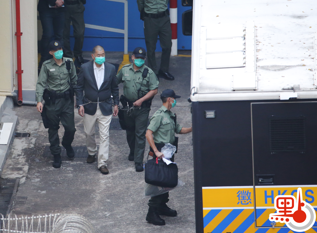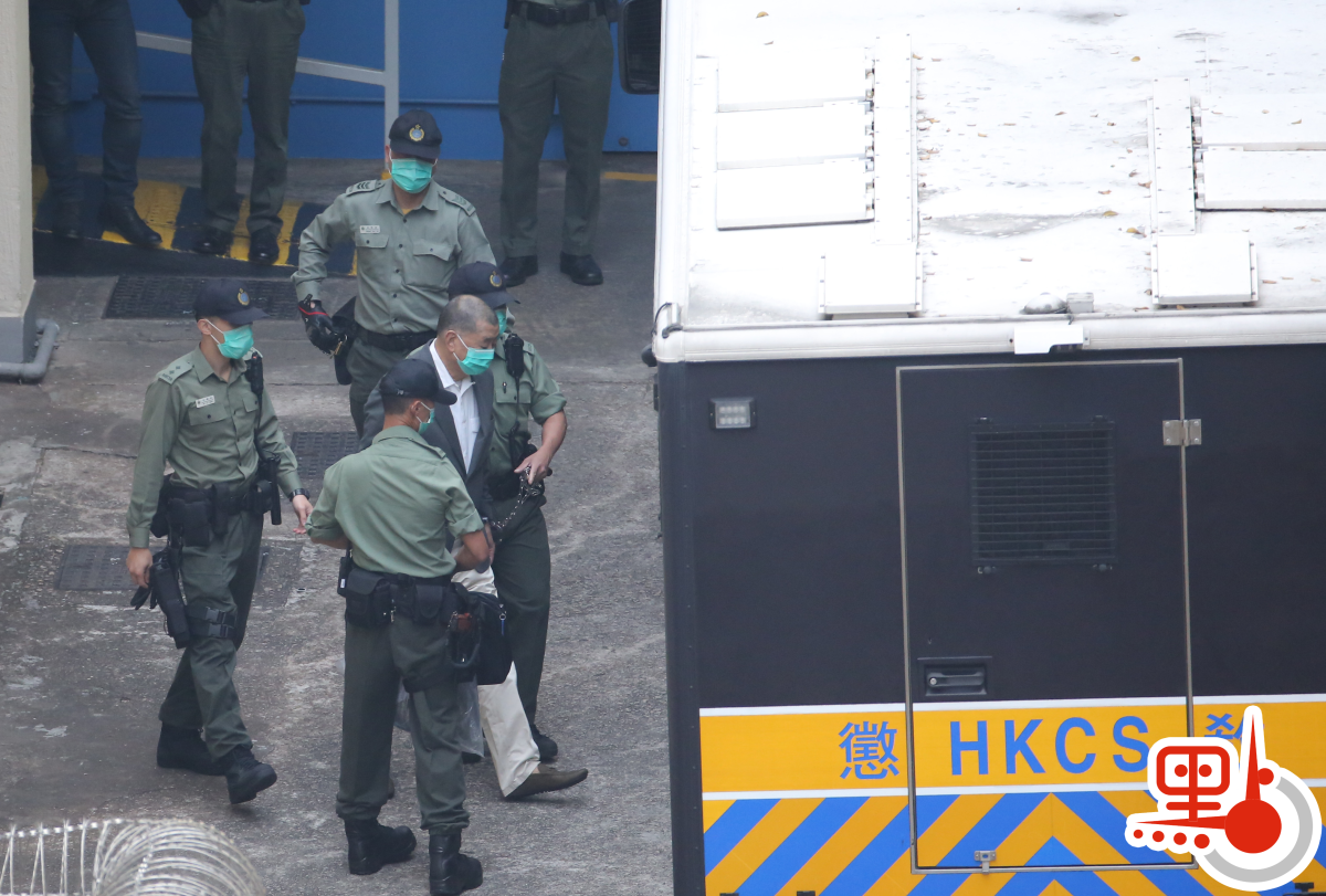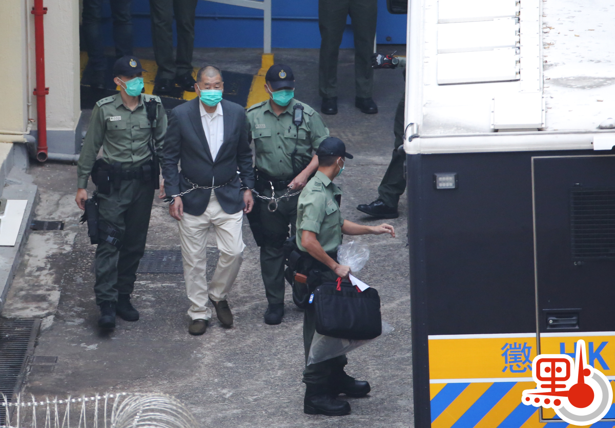 黎智英今早約8時離開荔枝角收押所,期間被鐵鏈纏腰、鎖上手扣,再由囚車押送到西九龍法院提訊。做法與押解重犯一樣。