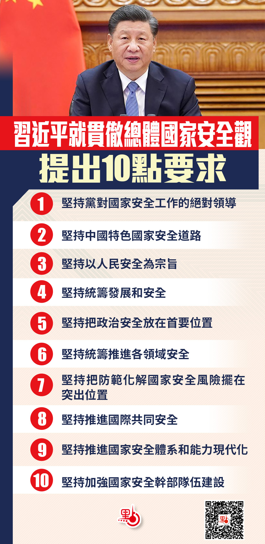 九是堅持推進國家安全體系和能力現代化,堅持以改革創新為動力,加強法治思維,構建系統完備、科學規範、運行有效的國家安全制度體系,提高運用科學技術維護國家安全的能力,不斷增強塑造國家安全態勢的能力。