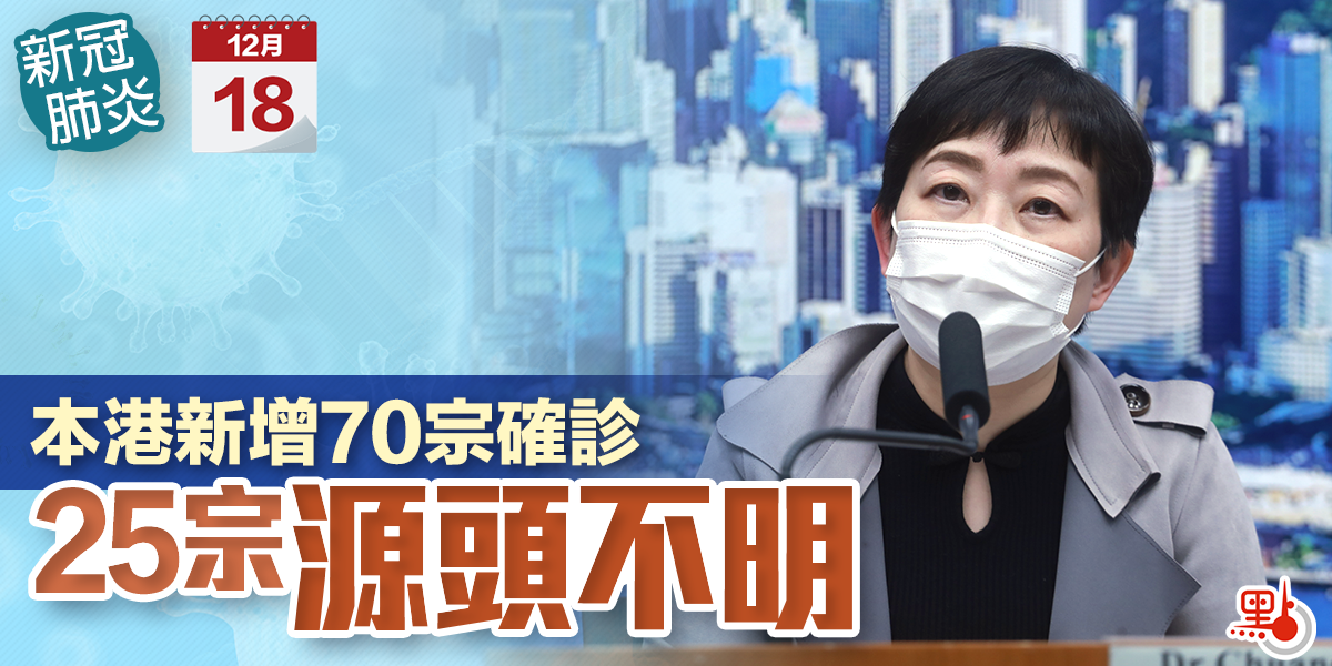 本港新冠肺炎疫情依然嚴峻,衞生署衞生防護中心傳染病處主任張竹君今日(18日)下午在疫情記者會上表示,截至今日凌晨零時,本港新增70宗新冠肺炎確診個案,包括64宗本地個案,當中25宗感染源頭不明,另外有6宗屬輸入個案。新增確診患者年齡從2到90歲,有27男43女,20宗由社區檢測中心找出。