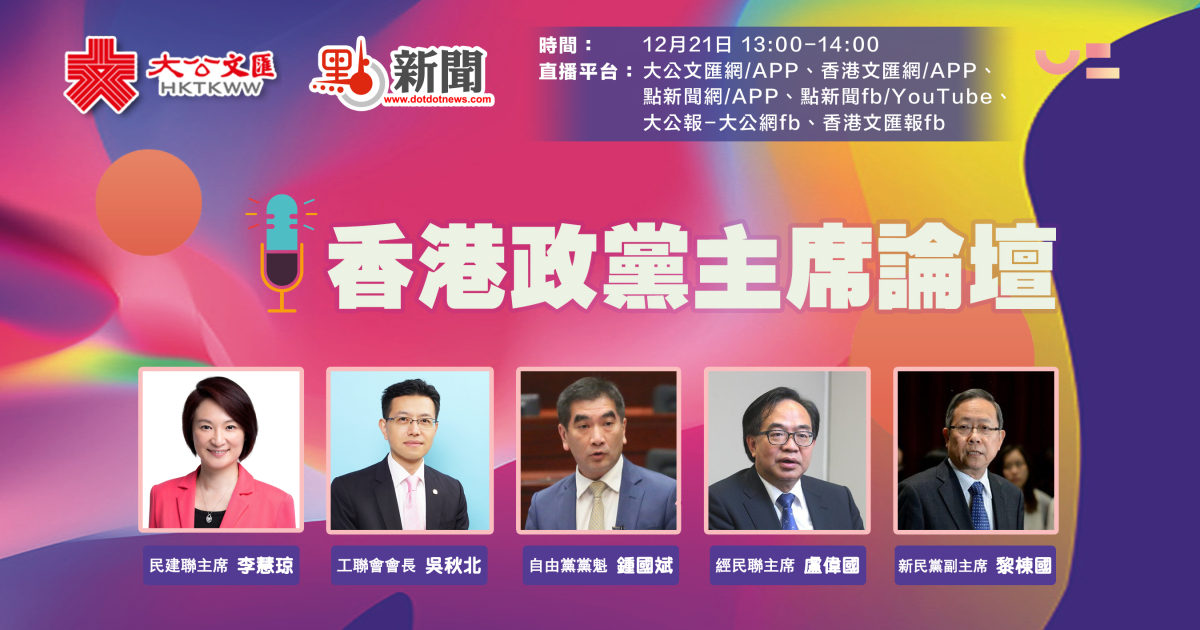 明日(21日)中午1時整,香港大公文匯與點新聞將聯合舉辦第二期「香港政黨主席論壇」,並在大公文匯各新媒體平台和點新聞平台同步直播。民建聯主席李慧琼、工聯會會長吳秋北、經民聯主席盧偉國、自由黨黨魁鍾國斌、新民黨常務副主席黎棟國等將做客直播間,與廣大市民分享建設力量政黨領袖們的思路、方法和舉措。