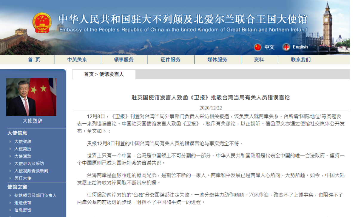 據中國駐英國大使館22日發布消息,英國《衛報》8日刊登對台灣當局外事部門負責人採訪相關報道,該負責人就兩岸關係、台所謂「國際地位」等問題發表一系列錯誤言論。中國駐英國使館發言人致函《衛報》,駁斥有關謬論,以正視聽。信函原文亦通過使館社交媒體公開發布。