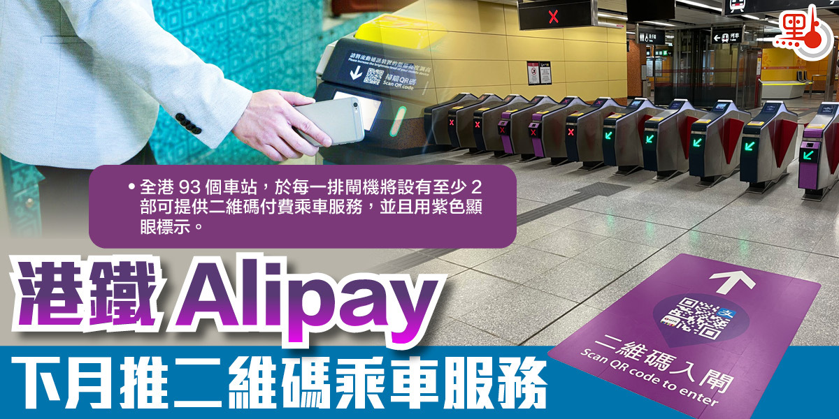 港鐵明年1月推「二維碼」乘車,電子錢包Alipay率先使用,港鐵及 AlipayHK今日(23日)公布,將於明年1月23日推出二維碼付費乘車服務,乘客只需透過MTR Mobile提供的「車票二維碼」或AlipayHK的易乘碼(EasyGo),便可輕鬆出入閘。港鐵全部93個重鐵車站(機場快綫車站除外),於每一排閘機均會設置最少2部閘機可提供二維碼付費乘車服務,且包上紫色顯眼標示。