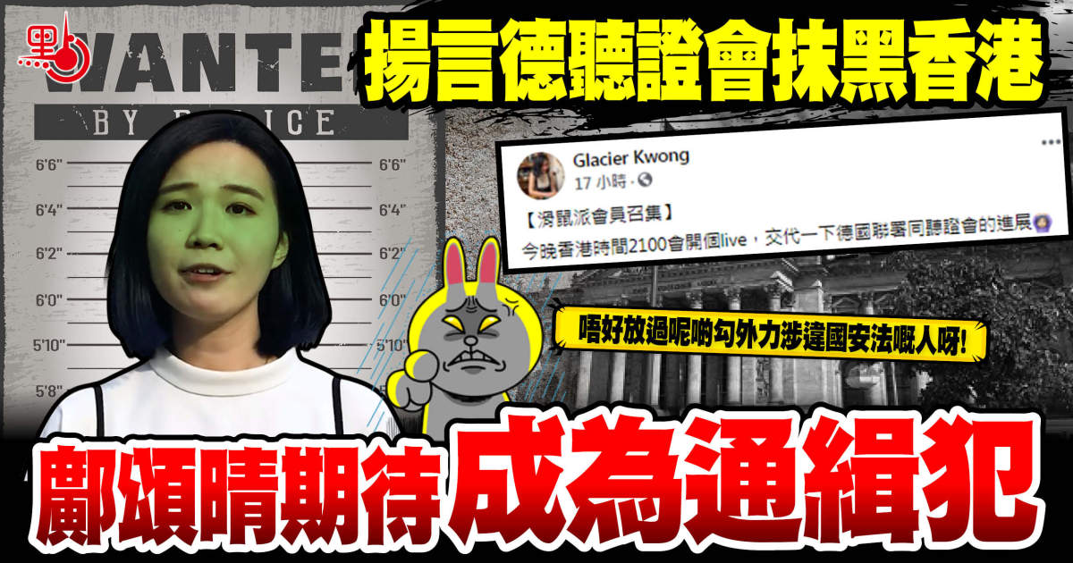 自覺在德國非常安全的鄺頌晴又話,期待出席聽證會後會成為港府通緝犯,聲稱這是「至高無上的榮譽」,又話是「係最低門檻嚟」喎。她又呼籲關注「流亡」海外的「手足」,叫人做「家長」,或者提供組織、物資協助。