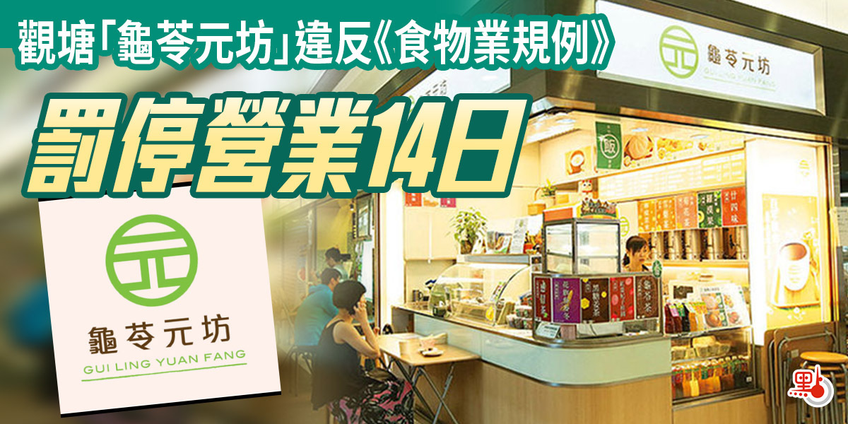 位於觀塘成業街7號地下43A鋪的「龜苓元坊」,其經營者因非法擴展營業範圍及無牌經營食肆,屢次違反《食物業規例》,被食物環境衞生署(食環署)署長暫時吊銷牌照14日,由今日(24日)至明年1月6日須暫停營業。