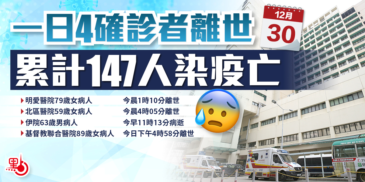 本港新冠肺炎疫情仍未受控,今日(30日)先後有4名確診患者離世,至今本港共有147名確診患者離世,當中143人於公立醫院離世。