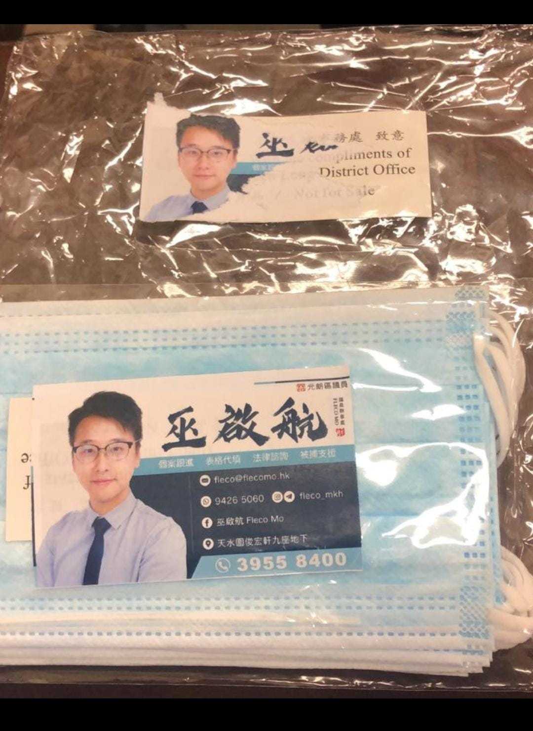 工聯會元朗地區主任姚國威今日(30日)接受點新聞記者訪問時表示,收到市民向他的查詢,他表示,由口罩的樣式及早前相片所見,相信巫啟航的口罩是來自元朗民政處早前提供的抗疫物資,可是有關的抗疫物資民政處有提供指引,其中列明派發方式「不可在口罩或其包裝上以貼紙方式加上機構/個別人士資料或任何宣傳方式」,明顯有違民政處要求。姚國威表示,已將有關的投訴向民政處反映,要求民政處跟進事件,以免公眾資源用於攬炒派議員的個人宣傳之用。