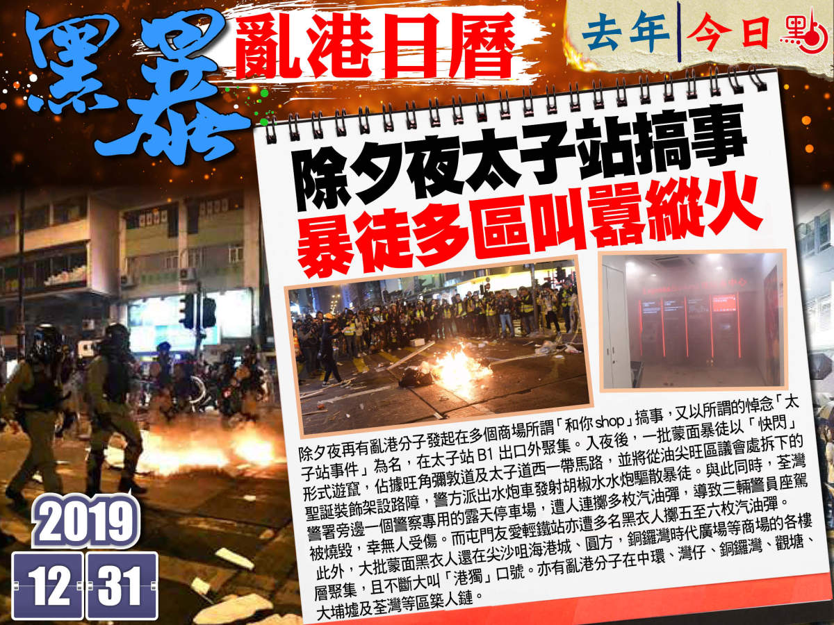 除夕夜再有亂港分子發起在多個商場所謂「和你shop」搞事,又以所謂的悼念「太子站事件」為名,在太子站B1出口外聚集。入夜後,一批蒙面暴徒以「快閃」形式遊竄,佔據旺角彌敦道及太子道西一帶馬路,並將從油尖旺區議會處拆下的聖誕裝飾架設路障,警方派出水炮車發射胡椒水水炮驅散暴徒。與此同時,荃灣警署旁邊一個警察專用的露天停車場,遭人連擲多枚汽油彈,導致三輛警員座駕被燒毀,幸無人受傷。而屯門友愛輕鐵站亦遭多名黑衣人擲五至六枚汽油彈。