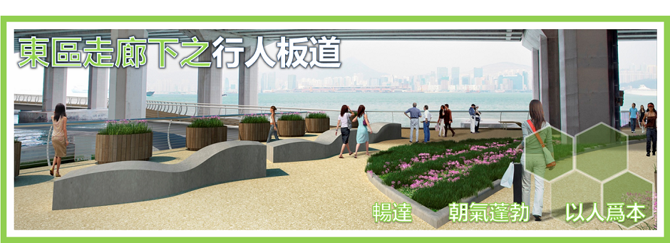 此外,擬建板道沿線將鋪設水管、污水管及公用設施,以配合設置洗手間、飲水機和小食亭等配套設施。工程亦會利用東區走廊現有樁柱式保護墩上的空間,建造合共6個觀景台,方便市民欣賞維多利亞港景色,並會建造1個釣魚平台,方便市民垂釣。