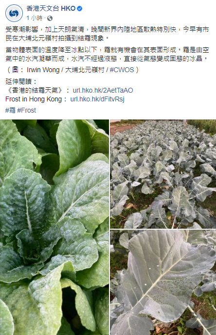 天文台又指,當物體表面的溫度降至冰點以下,霜就有機會在其表面形成。霜是由空氣中的水汽凝華而成,水汽不經過液態,直接從氣態變成固態的冰晶。