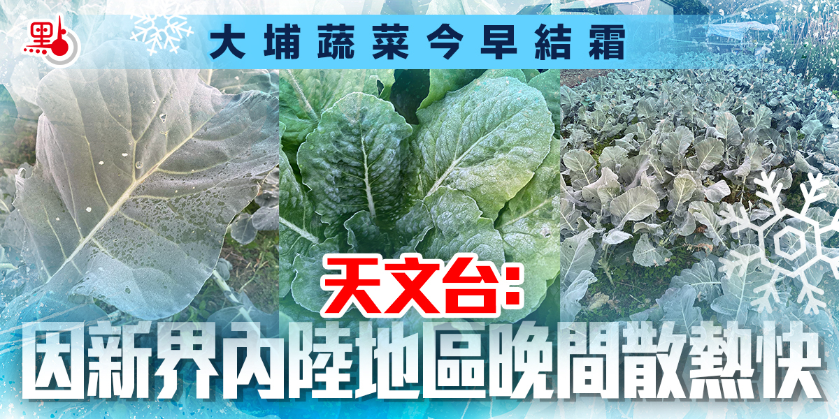 本港近日天氣轉涼,寒冷天氣警告仍然生效,亦曾發出霜凍警告。天文台今日(2日)下午在社交平台發文指,受寒潮影響,加上天朗氣清,晚間新界內陸地區散熱特別快,因此今早有市民在大埔北元嶺村拍攝到結霜現象。