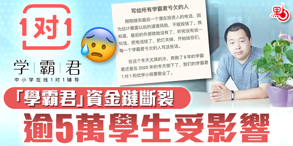 內地大型網上補習社「學霸君」宣布資金鏈斷裂,影響5萬多名學生。