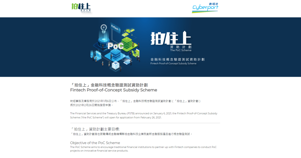 財經事務及庫務局今日(6日)公布,「拍住上」金融科技概念驗證測試資助計劃由2月26日至6月30日接受申請。「拍住上」資助計劃旨在鼓勵傳統金融機構夥拍金融科技企業就創新金融服務產品進行概念驗證測試。每個獲批的概念驗證測試項目一般可獲最多10萬元至15萬元的資助額。