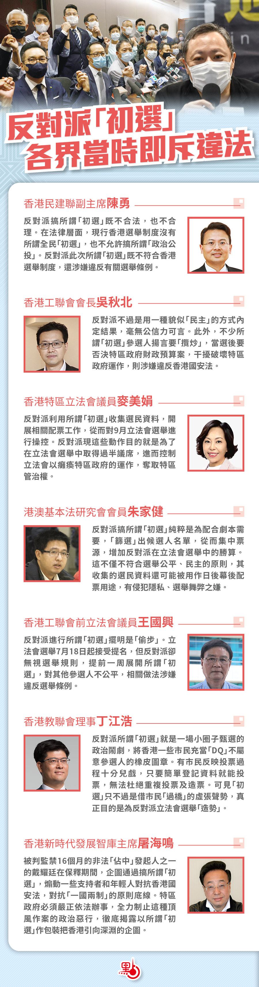 香港不同界別人士去年就曾痛批,所謂「初選」就是一場政治鬧劇。反對派打着「民主」旗號進行選舉黑箱操縱,妄圖在下一屆立法會選舉中獲得過半議席,進而癱瘓特區政府運作,奪取特區管治權。「初選」既不合理,也不合法,特區政府應果斷執法,確保「一國兩制」行穩致遠。