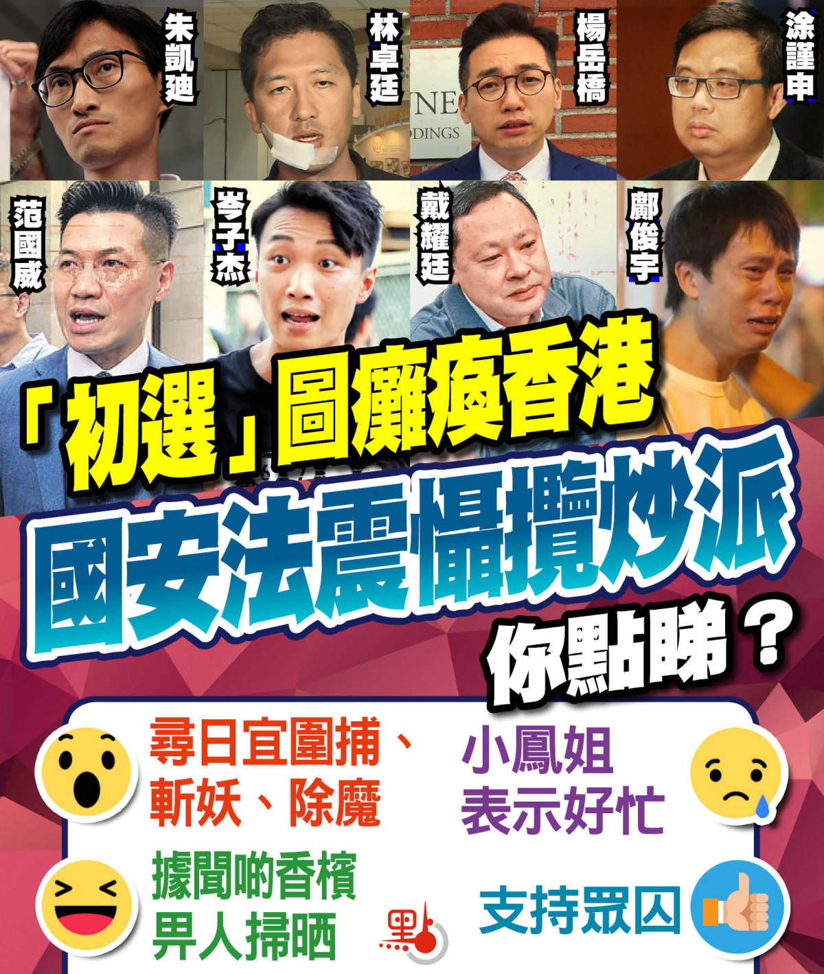 53名發起或參與去年攬炒派「初選」人士被捕,他們涉嫌違反《港區國安法》中顛覆國家政權罪,當中6人負責組織策劃,47人參與。「初選操盤手」戴耀廷早於去年4月就在發表文章,列出所謂「攬炒十步曲」,目的是迫令特首辭職、特區政府停擺,令香港社會陷入停頓,最終要令西方國家對中國實行政治及經濟制裁。香港國安法去年6月30日生效實施後,給攬炒黑暴極大震懾,社會明顯由亂向治,人心更加思穩,但仍有潛藏的黑暴分子仍伺機挑戰國安底線。