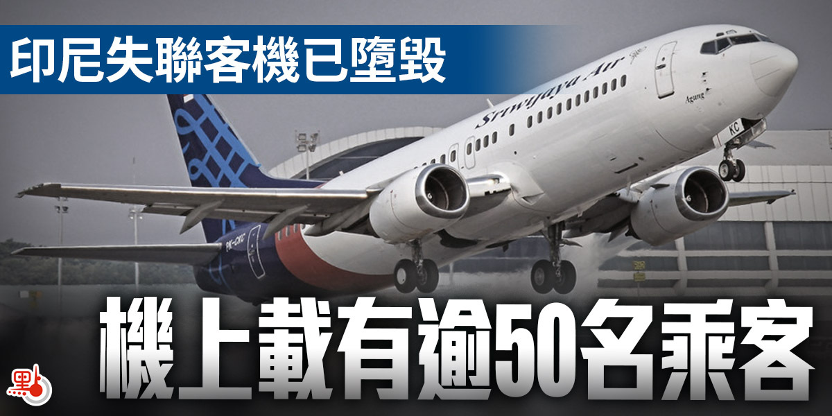 印尼三佛齊航空(Sriwijaya Air)公司一架客機,今日(9日)由雅加達起飛後4分鐘便失聯,機上載有50多名乘客,最後一次聯繫是在當地時間下午2時20分。最新消息指,印尼交通部海岸巡邏船船長證實該架客機已經墮毀,當地搜救單位在海面打撈到疑似為該班機的殘骸。