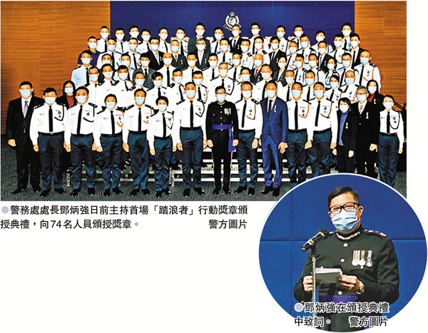 警務處處長鄧炳強日前主持首場「踏浪者」行動獎章頒授典禮,向74名人員,包括六大總區指揮官在內的30名前任及現任處長級人員,及44名在「踏浪者」行動中英勇執勤而受傷的同袍頒授獎章,其他獲獎人由主要單位指揮官稍後代表處長頒授。