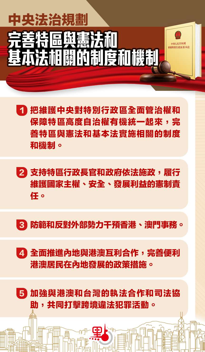 中共中央近日印發未來5年的《法治中國建設規劃》(下稱規劃),強調依法維護國家主權、安全和發展利益的部分,提到要依法保障「一國兩制」,貫徹「港人治港」、「澳人治澳」、高度自治方針,把維護中央對特別行政區全面管治權和保障特區高度自治權有機統一起來,完善特區與憲法和基本法實施相關的制度和機制。支持特區行政長官和政府依法施政,履行維護國家主權、安全、發展利益的憲制責任。防範和反對外部勢力干預香港、澳門事務。規劃又要求全面推進內地與港澳互利合作,完善便利港澳居民在內地發展的政策措施。加強與港澳和台灣的執法合作和司法協助,共同打擊跨境違法犯罪活動。