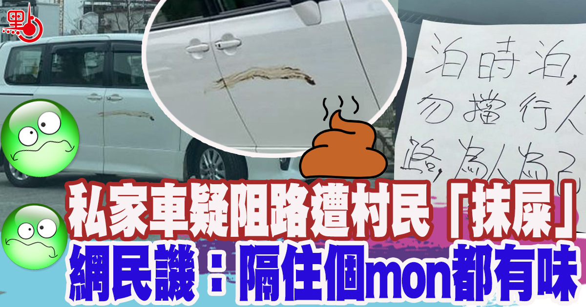 噚日有網民喺FB群組「小心駕駛(討論別人同駕駛態度)」send相並發文指,經過大埔樟樹灘村時,疑有村民因不滿一輛白色私家車堵塞行人過路處竟然將屎抹在車上,車頭更附上一張告示,寫着「泊時泊,勿擋人路,為人為己,本村村民示」。