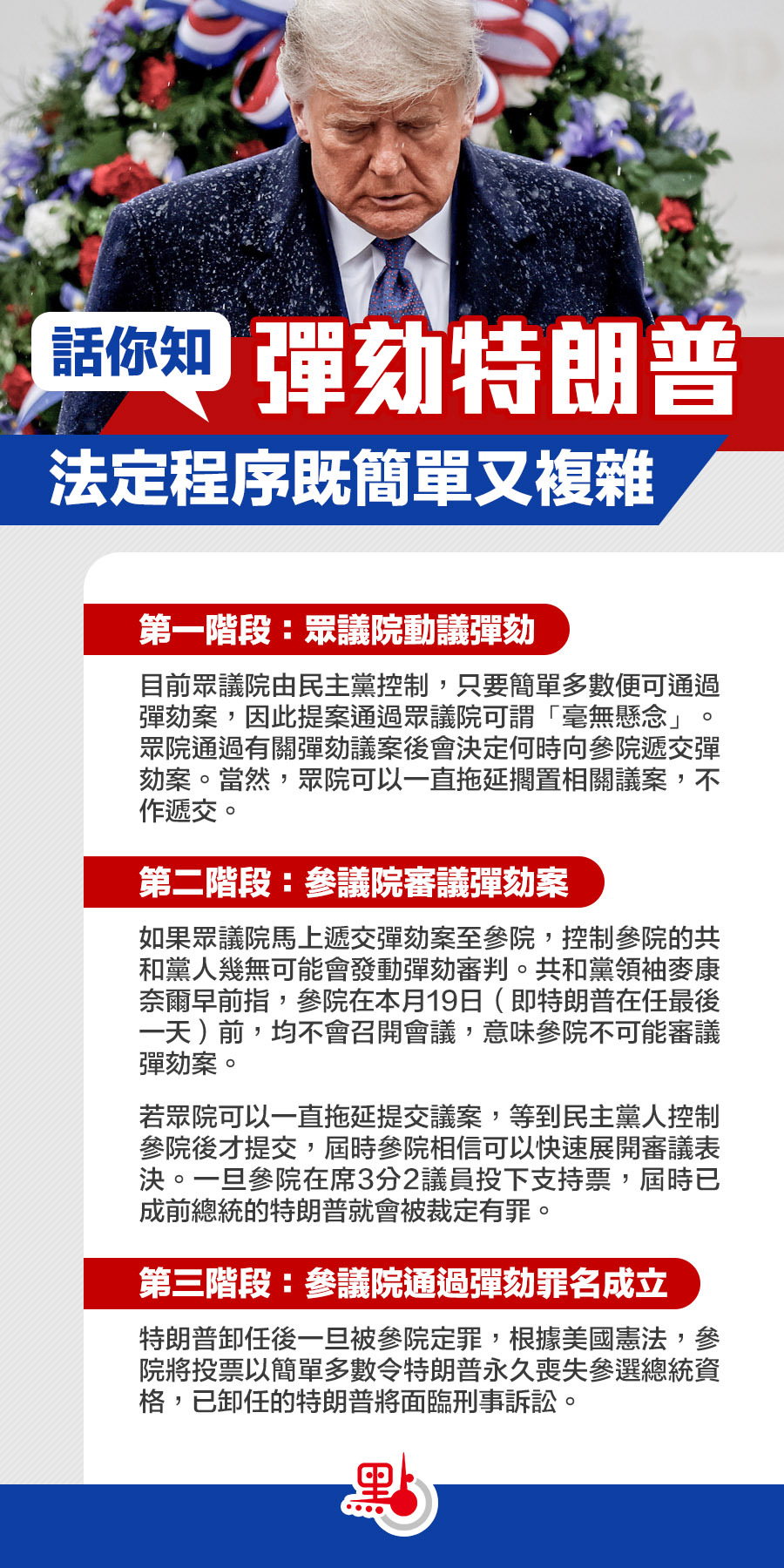 美國眾議院計劃在周三,就彈劾總統特朗普的決議案展開辯論,會是特朗普任內第二次遭到彈劾挑戰。美國現任副總統彭斯已去信眾議院議長佩洛西,表明不支持引用憲法25修正案罷免總統特朗普。彭斯在信中表示,特朗普任期只餘下8日,不認為罷免特朗普符合國家最佳利益和憲法,亦會成為可怕的先例。面對特朗普任期只剩一周的時間,一般相信民主黨的彈劾動議甚至罷免動議只具政治象徵意義,其實並不會產生實質後果。當然不排除一個可能,即民主黨控制參眾兩院後不遺餘力地窮追猛打特朗普,到時,特朗普的麻煩可就真的來了。