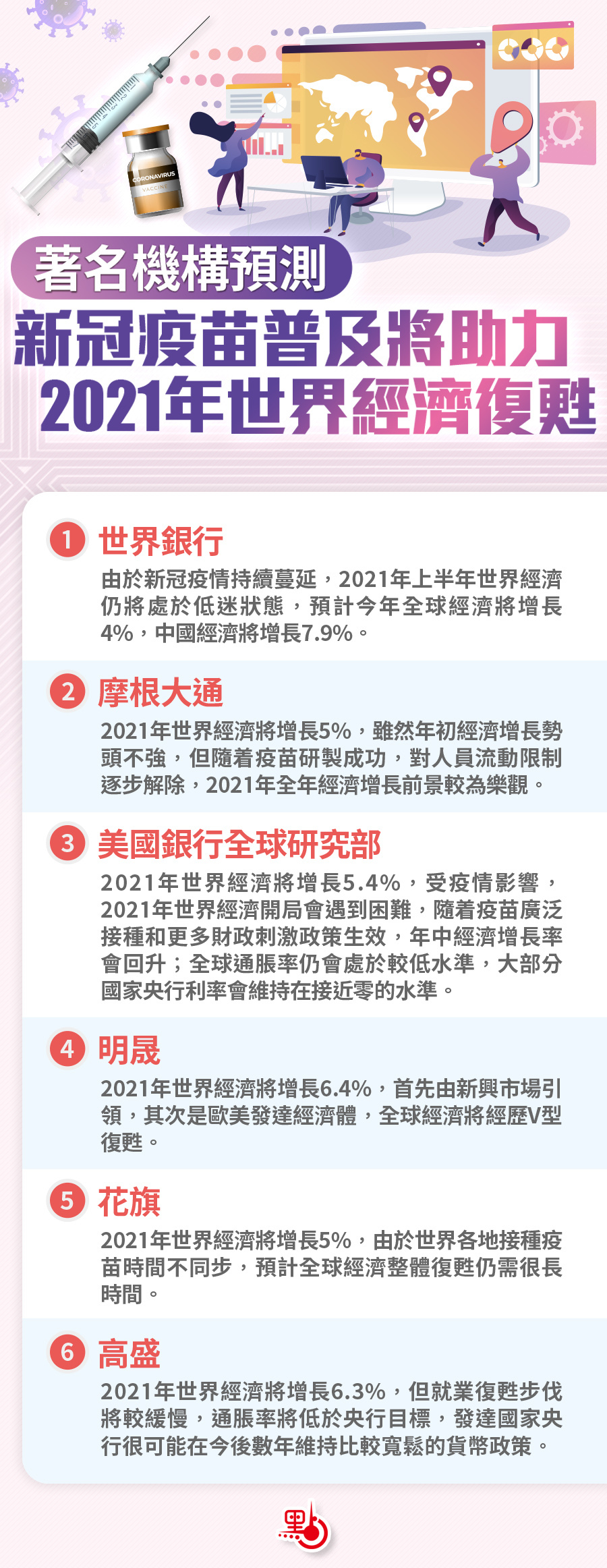 到底2021年全球經濟是繼續深陷泥潭,還是逐步走向復甦,多家金融機構近期陸續發布經濟展望報告,對2021年世界經濟走勢作出預測。這些機構普遍認為,由於疫情影響還在持續,2021年世界經濟或將開局不順,但新冠疫苗普及和更多財政刺激政策生效將助力世界經濟復甦。