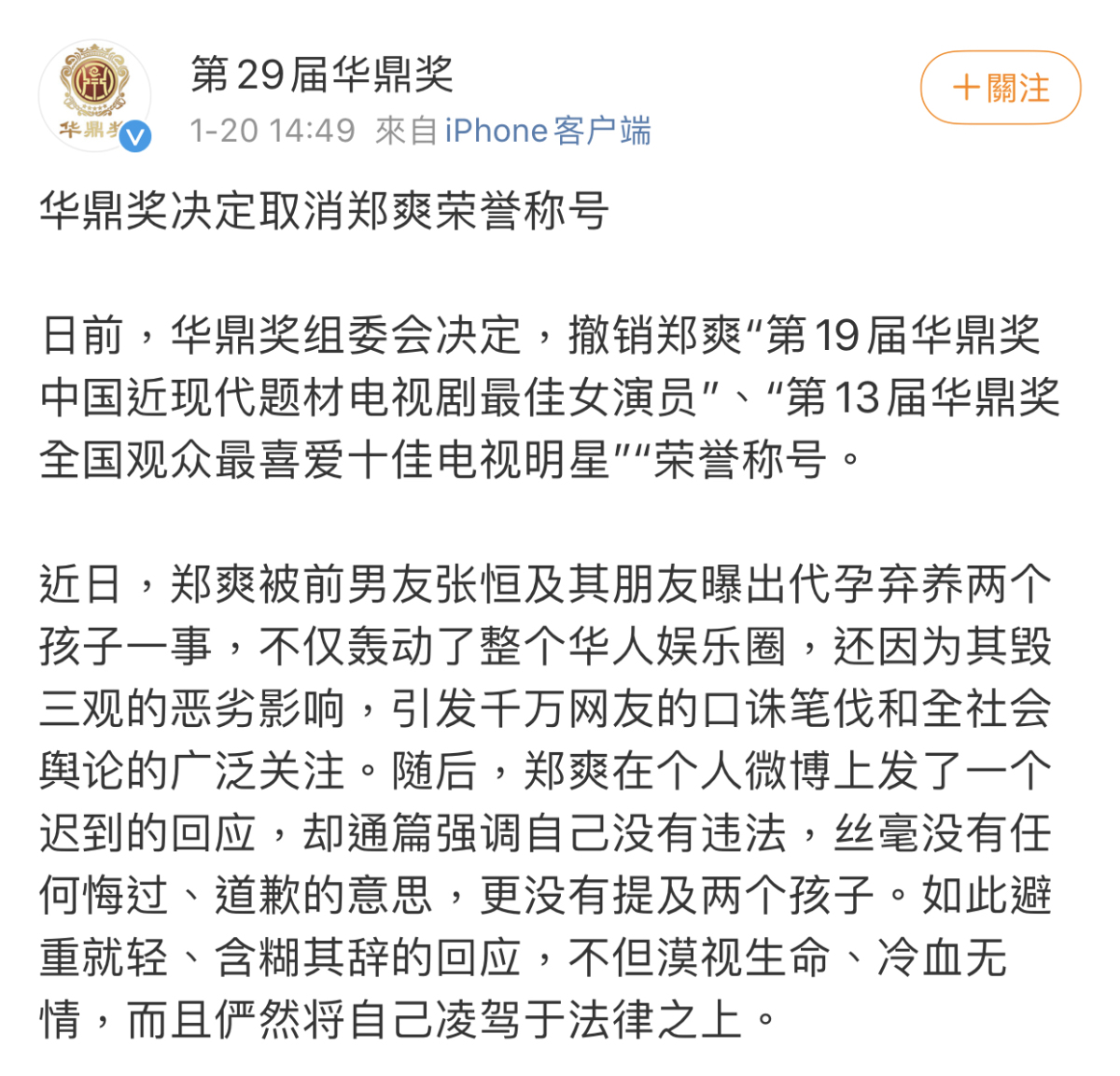 鄭爽近日風波不斷,早前被爆與張恒秘婚及離婚,並在美國代孕生子,其後更爆出其想棄養及錢債官司等醜聞。華鼎獎組委會負責人對此嚴正表示:「代孕棄養事件的曝光,讓鄭爽的人設瞬間崩塌,這是她咎由自取,更與當初我們授予榮譽的初衷背道而馳。所有人都為曝光的代孕棄養行為而感到震驚。踐踏公民權益、敗壞人倫道德是對我們所珍惜的一切的挑戰。這絕不能容忍。」