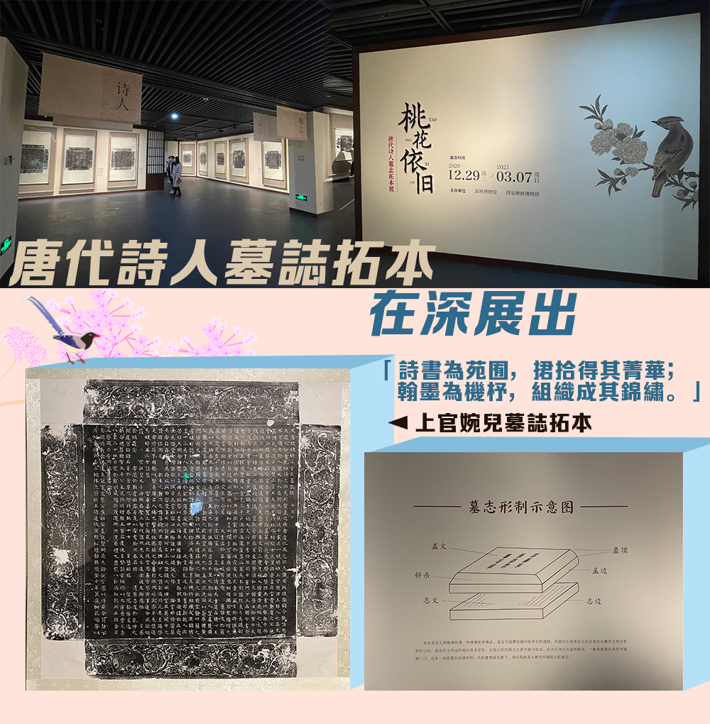 《桃花依舊——唐代詩人墓誌拓本展》目前在深圳博物館古代藝術館(同心路6號)第6專題展廳展出,時間為2020年12月29日-2021年3月7日。博物館無需門票,但因應疫情防控,需提前三天在網上預約,亦可現場掃碼預約。