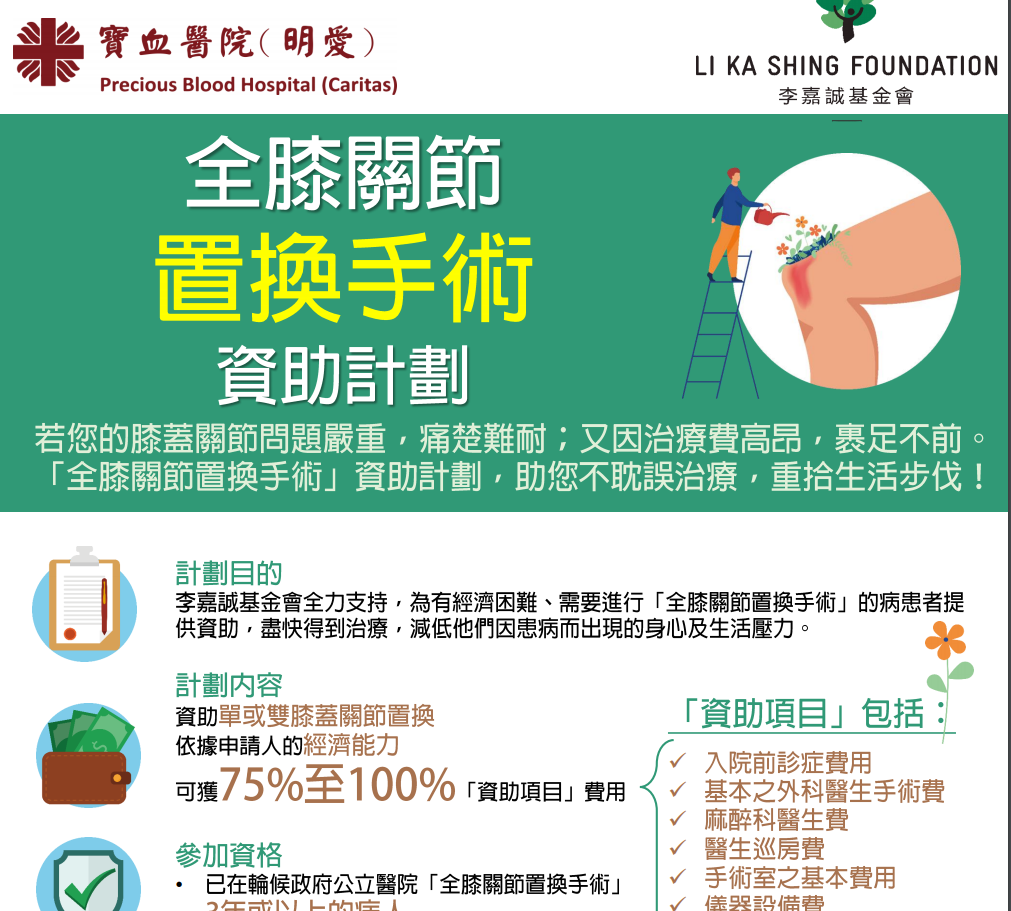 膝關節問題困擾不少長者,但膝關節置換手術費用不菲,輪候時間更可能長達5年以上,為免耽誤治療,李嘉誠基金會與寶血醫院聯合推出「全膝關節置換手術」資助計劃,期望縮短病人輪候時間,只要符合4個條件就可以申請。