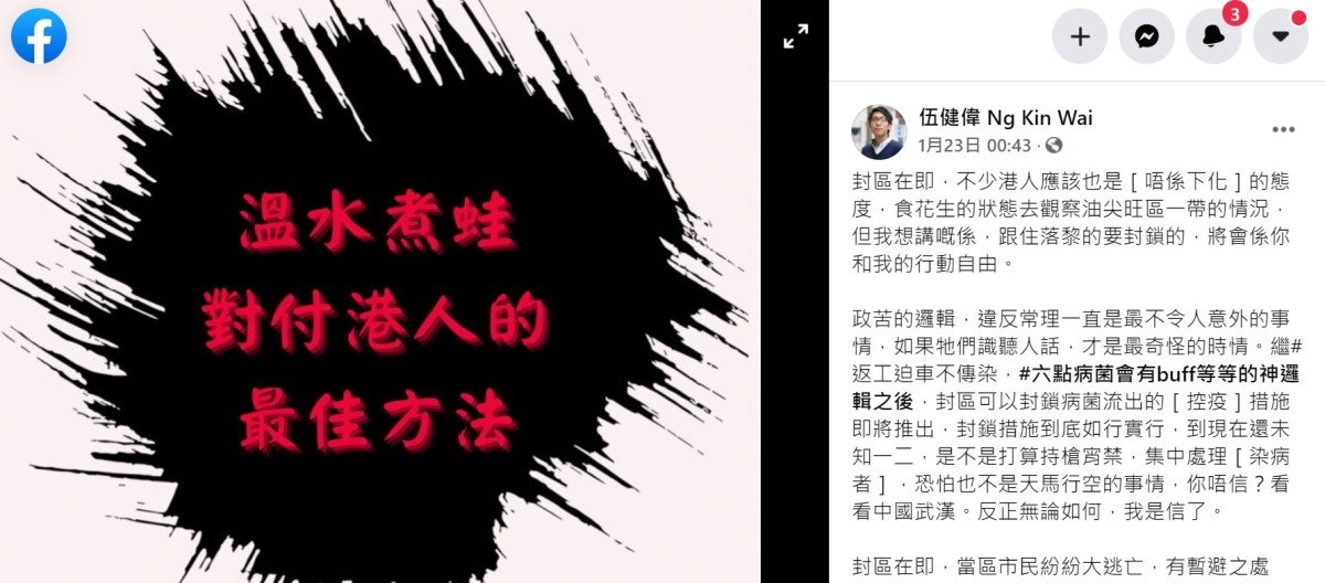 政府23日凌晨4時起在佐敦劃出「受限區域」,指區內相關人士需接受強制新冠病毒檢測。攬炒派區議員伍健偉在社交媒體發文抹黑檢測,更企圖煽動市民用暴力抵制強制檢測,有團體批評該議員的行為煽惑他人以暴力阻礙政府抗疫,涉嫌違反國安法及《區議會條例》,已向民政事務局、警方國安處舉報相關事件。