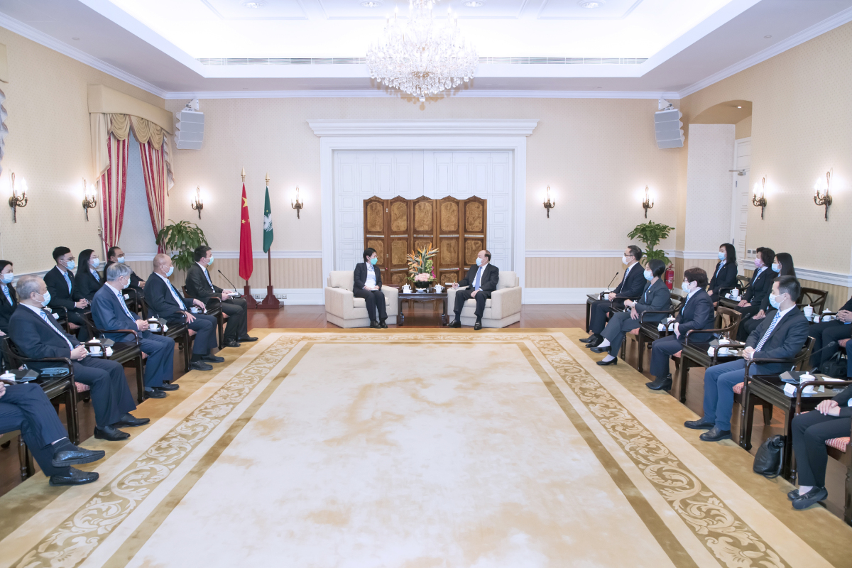 澳門行政長官賀一誠26日在政府總部會見澳門街坊會聯合總會新一屆領導層,就疫情防控、經濟復甦、社會服務及房屋政策等議題交流意見。