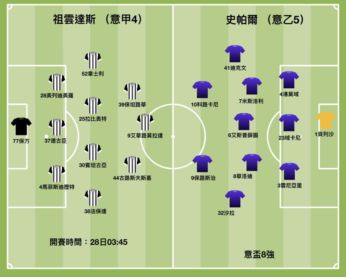 祖雲達斯將於明日(28日)凌晨的意大利盃8強,主場欣逢唯一乙組球隊史帕爾,雖然祖雲若干主力如C朗拿度、基亞連尼、邦路斯等極可能休戰或先退居後備,但已復出的馬菲斯迪歷特、小將古路施夫斯基和韋斯頓麥堅尼,加上艾華路莫拉達、拉比奧特等,整體質素依然凌駕於客軍,主帥派路剛拿到執教生涯首個錦標後,勢必乘勝追擊並望協助C朗取得加盟後仍未能捧起的意大利盃,今戰有能力大炒客軍而晉級4強。(28日凌晨3時45分開賽)
