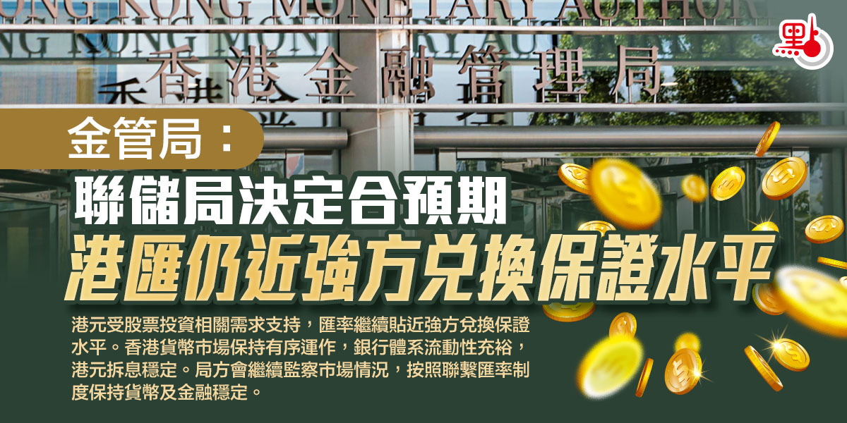 金管局又指,港元受股票投資相關需求支持,匯率繼續貼近強方兌換保證水平。香港貨幣市場保持有序運作,銀行體系流動性充裕,港元拆息穩定。局方會繼續監察市場情況,按照聯繫匯率制度保持貨幣及金融穩定。