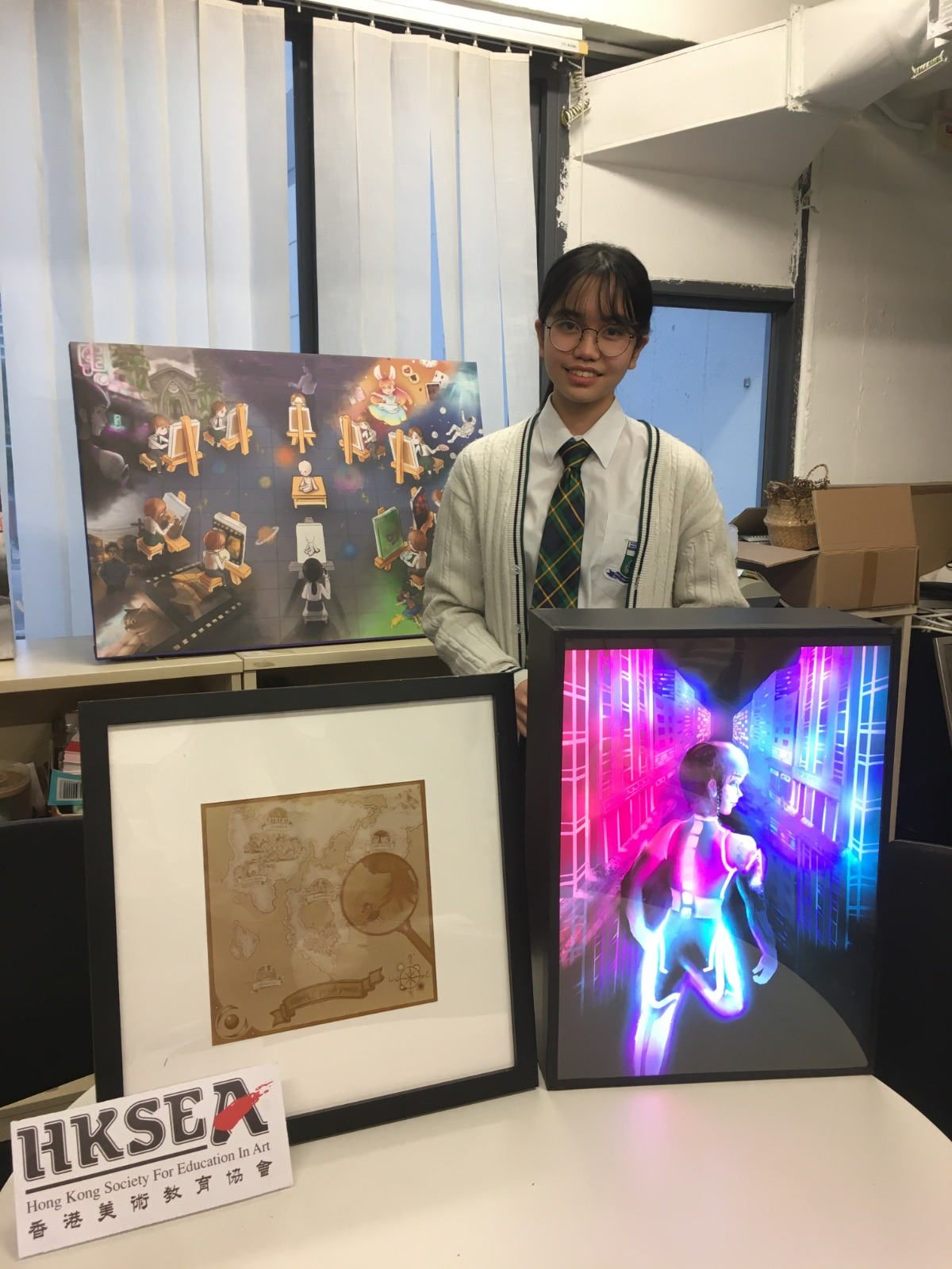 繁重的學業與電繪創作,不時會有衝突,鮑森蕾舉例,參加葛量洪視覺藝術獎時臨近考試,既要準備作品又要溫書,總要搞到很夜才睡,但卻享受其中,不捨放棄電繪這塊「心頭肉」。她的三幅作品最終獲選2019/2020葛量洪視覺藝術獎,並於1月的網上香港視覺藝術教育節2020(www.hksea.org.hk/hkvaef-2020)展出。對於第一次用電繪作品參賽就獲佳績,鮑森蕾坦言十分開心,滿有成就感。細看她的作品,每一幅都有獨特含義。其中一幅最搶眼作品是一個發光裝置,內嵌一張印有電繪圖畫的膠片,畫上的主角沒有小腿,身邊也沒有朋友,但他的臉仍在微笑,「呼籲大家不要歧視殘疾人,而殘障亦要積極活出一片天。」至於為什麼用燈箱裝置輔助,她說自己住在將軍澳,不算鬧市,但晚上在房間熄燈後,從窗口向外望發現很亮,覺得香港光污染很嚴重,有需要重視,而燈箱炫麗光線亦與殘障者五彩人生相得益彰。