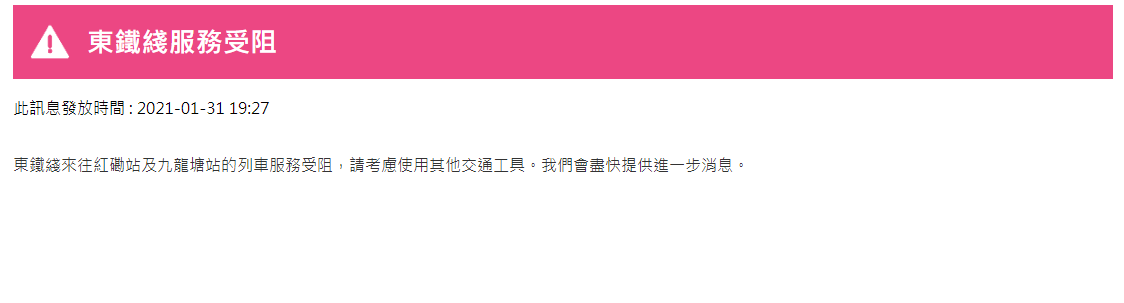 港鐵表示,東鐵線旺角東站有人進入路軌範圍,現時紅磡站至旺角東站來回方向服務暫停。現時來往九龍塘站至上水站列車服務每8分鐘一班。
