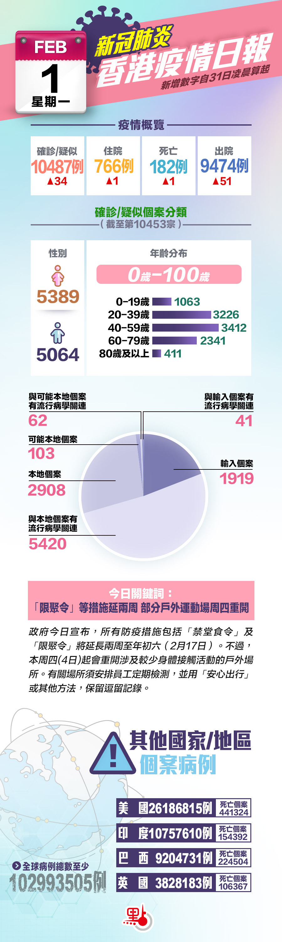 本港今日新增34宗確診個案,涉及16男18女,年齡介乎2個月至83歲,包括5宗輸入個案及29宗本地感染,本地個案中,8宗源頭不明,其餘21宗與早前個案有關,包括2宗綠楊新邨R座04單位個案。本地感染個案中有9宗是由社區檢測中心及流動檢測站驗出,另有20多宗初步確診個案。本港累計共10487宗病例。