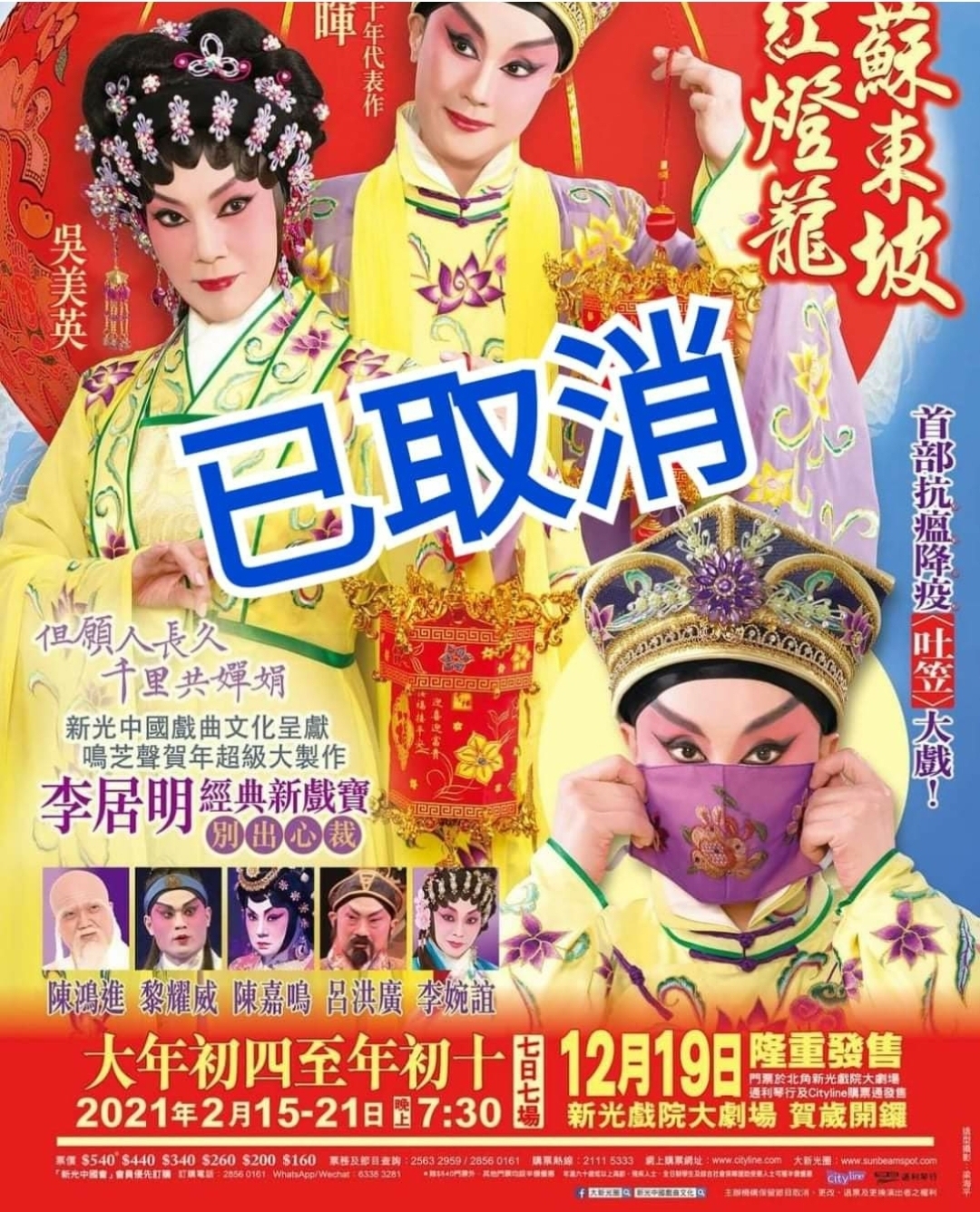 新冠肺炎持續,政府延長限聚令至2月17日(年初六),各表演劇場保持關閉。新光戲院今日(2日)宣布,原訂於2月15至21日舉行的賀歲粵劇《大紅燈籠蘇東坡》取消所有表演場次。