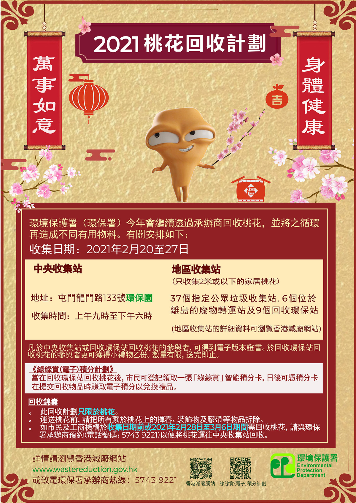 為方便市民回收春節後擬棄置的桃花,環保署今日(4日)宣布,桃花回收計劃地區收集站由去年的43個增至52個,包括37個垃圾收集站、6個離島廢物轉運設施及9個回收環保站,開放日期為2月20日至27日。參與者均會獲發電子證書,以及小禮物一份,市民還可以登記領取一張「綠綠賞」積分卡,日後兌換禮品。