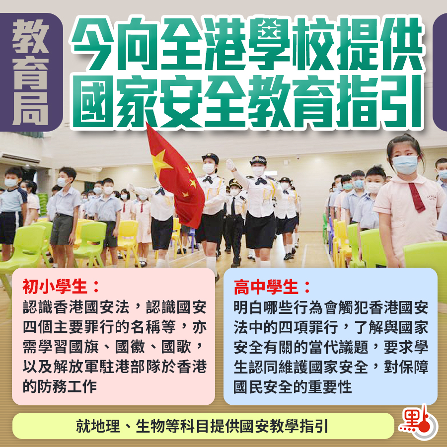 教育局今日(4日)向全港學校發通告,提供國家安全教育指引。指引要求初小學生認識甚麼是香港國安法,國安法四項主要罪行的名稱等,亦需要學習國旗、國徽、國歌,以及了解解放軍駐港部隊於香港的防務工作。高中學生則須了解哪些行為會觸犯香港國安法中四項主要罪行,亦要研習與國家安全有關的當代議題,要求學生認同維護國家安全,對保障國民安全的重要性。