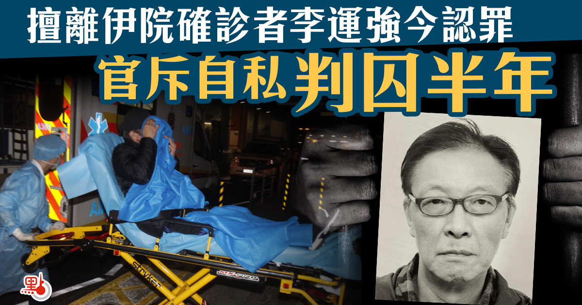 63歲的本地男子李運強,在確診新冠肺炎後於去年12月18日逃離伊利沙伯醫院隔離病房,他3日後在旺角街頭被截獲,隨後被送返醫院接受隔離。李運強其後被落案控告一項任何人不得使他人蒙受感染的危險罪,今日(5日)他在九龍城法院認罪。裁判官鄭潤聰直斥李運強行為非常自私,罔顧香港市民的安全。鄭官指,李在確診期間離開醫院,可能觸發疫情擴散,法庭需向公眾發放清晰訊息,本案非常嚴重,不能以罰款了事,遂判他即時監禁6個月。