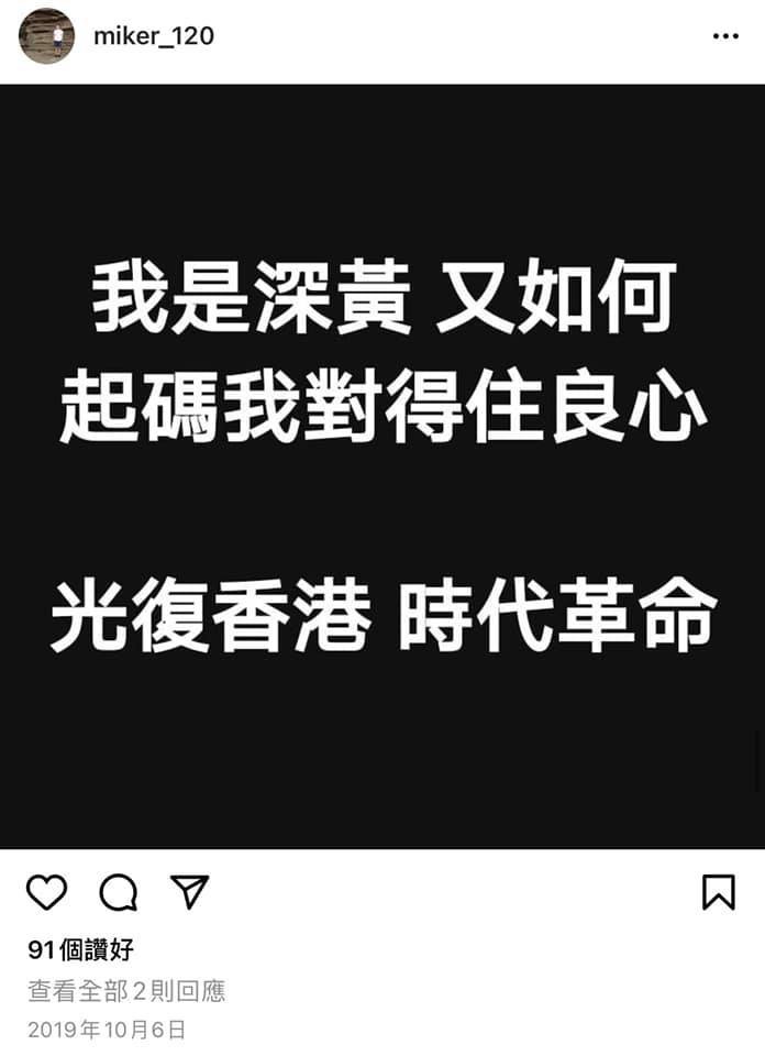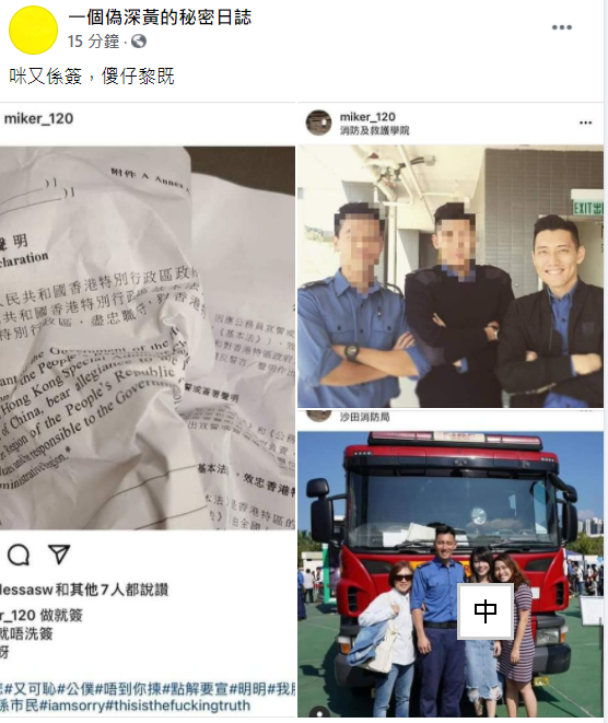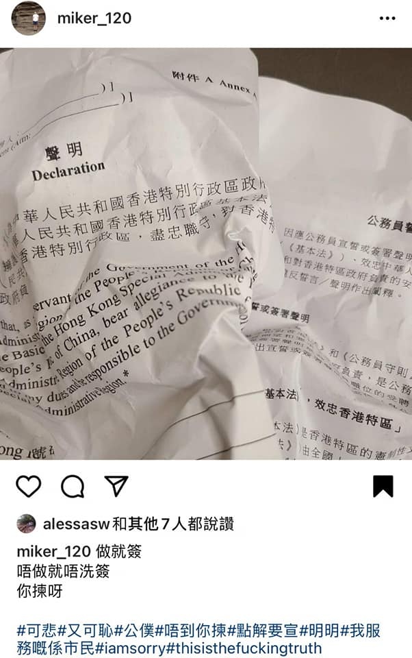 據了解,近日網上多個群組流傳一輯相片,內容指一個網名「miker_120」的男子在網上反對簽署聲明擁護基本法及效忠特區,並將已破壞的宣誓聲明書上載到Instagram。根據讀者提供及網上可見的相片,相信該名男子為沙田消防處職員之一,自2019年更在網上張貼大量支持黑暴的言論,當中更包括「光復香港、時代革命」等有「港獨」含意的口號。