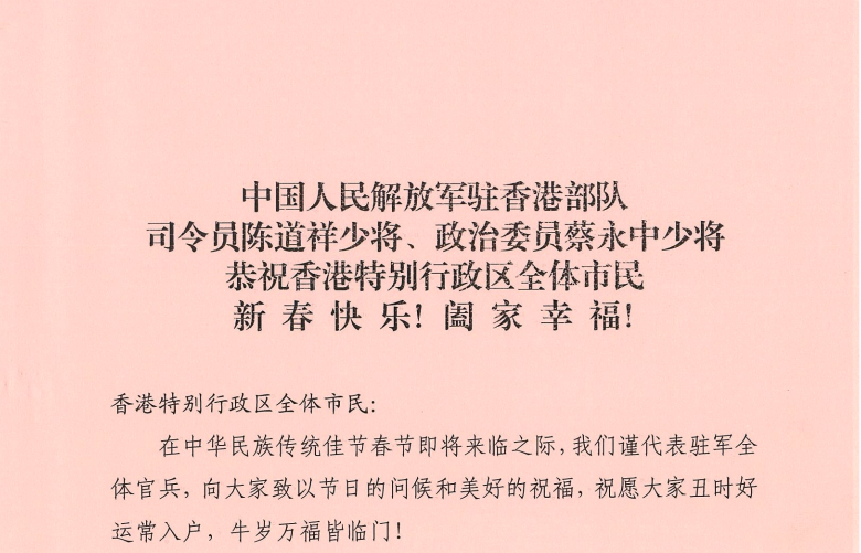 牛年春節將至。中國人民解放軍駐香港部隊司令員陳道祥和政治委員蔡永中今日(8日)發表公開信,祝全港市民新春快樂,闔家幸福,又回顧過去一年香港內地守望相助,骨肉深情的事跡,強調駐港部隊將堅決維護國家主權、安全、發展利益,為維護香港長期繁榮穩定作出新的更大貢獻,以優異成績迎接中國共產黨百年華誕!
