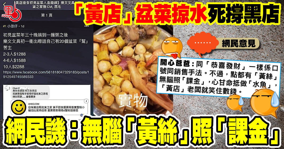 眾所周知,所謂「黃色經濟圈」無非係啲出名「黃店」嘅斂財招牌,「黃絲」仲要畀「黃店」老闆當ATM咁撳,做咗「水魚」都唔知。近日有網民「依家啲90後真係」喺連登上發帖話,近年嚟好多「黃店」喺淘寶買貨後隨便印啲所謂「抗爭」文宣就可以大賣,可惜無腦「黃絲」照單全收,仲有「黃店」借賣高價盆菜嚟搵快錢,但供應商「吃貨之家」被揭有黑歷史之後「黃店」堅決唔換,仲反鬧網民。