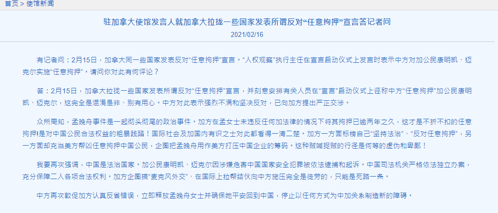 加拿大昨日拉攏部分國家發表所謂的反對「任意拘押」宣言,並刻意安排有關人員在「宣言」啟動儀式上誣稱中方「任意拘押」加公民康明凱、邁克爾。對此,中國駐加拿大使館發言人今日(16日)表示,此舉完全是混淆是非、別有用心。中方對此表示強烈不滿和堅決反對,已向加方提出嚴正交涉。