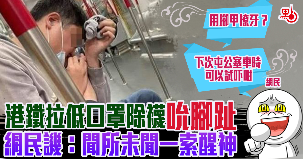 近日有網民喺fb群組「屯門公路塞車關注組」上發帖文話,自己乘搭港鐵時,見到坐喺隔壁嘅男子摘下口罩,將右腳放上左腳大腿上,脫下襪子吮食及聞腳趾。事主幽默話:「下次屯公塞車時可以試吓咁。」