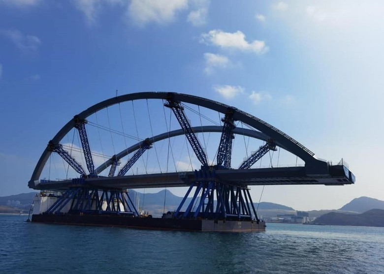 全港首條同時設有行車道、行人路、單車徑及觀景台的海上高架橋——將軍澳跨灣連接路,其中一部分的雙拱鋼橋今日(16日)已運抵香港,並即將進行安裝,預計將於明年竣工。運輸及房屋局局長陳帆早前表示,此雙拱鋼橋長度約為200米,重量達1萬公噸,即與50架飛機客機重量相若,為全港最大跨度及最重的預製鋼拱橋。橋身以預製方式建造,生產及裝嵌耗時一年半。