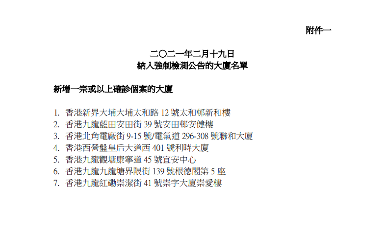 政府今日(19日)刊憲,要求在2月6日至今日期間,曾身處大埔太和邨新和樓、藍田安田邨安健樓、北角電廠街聯和大廈、西營盤皇后大道西利時大廈、觀塘康寧道宜安中心、九龍塘界限街根德閣第5座,以及紅磡崇潔街崇字大廈崇愛樓超過2小時的人,需在本周日或之前接受新冠病毒檢測,如果在本周三至今日已進行檢測,會獲視為已遵從強制檢測公告的規定。